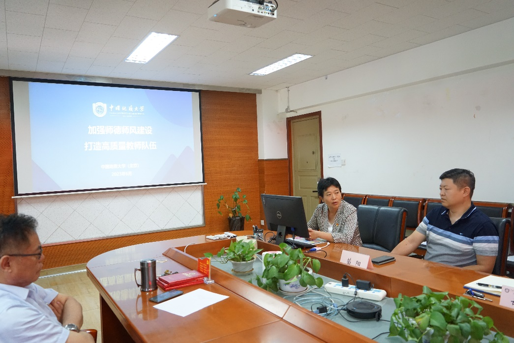 学院党委书记孟庆芬做“加强师德师风建设,打造高质量教师队伍”专题报告。传达《中国地质大学(北京)关于开展师德集中学习教育的通知》的文件精神和相关要求,指出教师是立教之本,评价教师队伍素质的第一标准应该是师德师风。