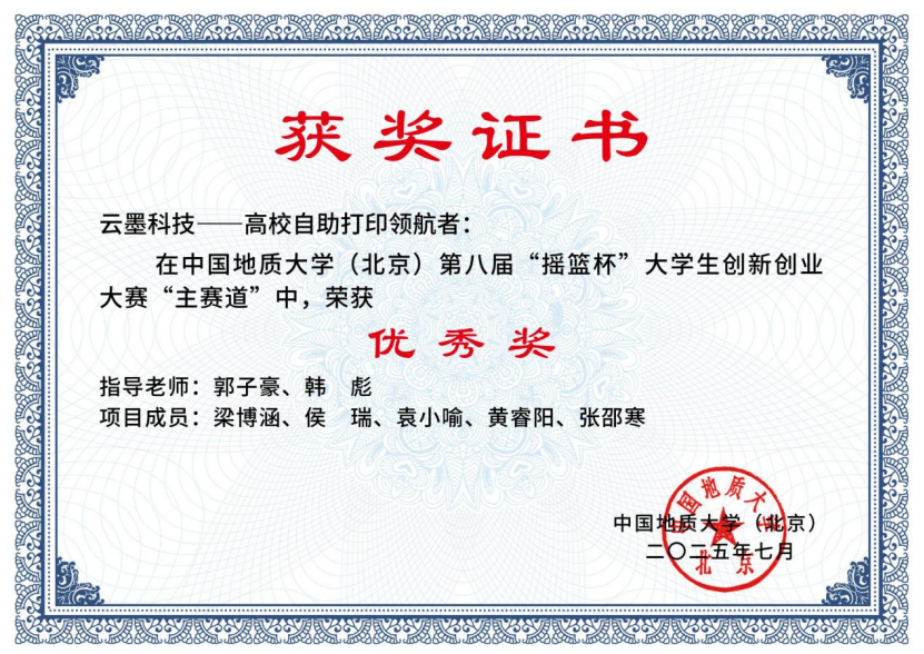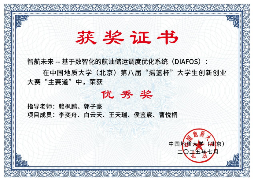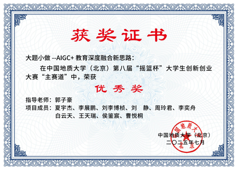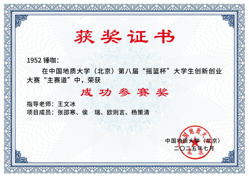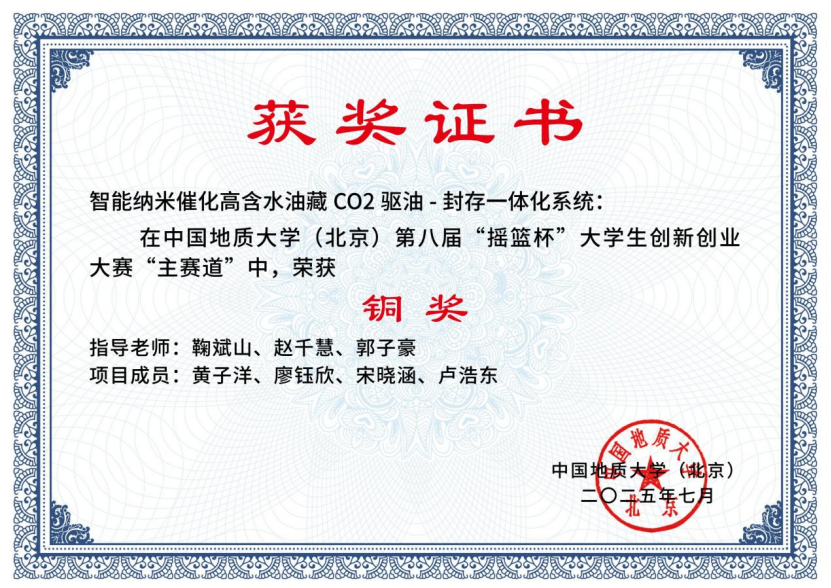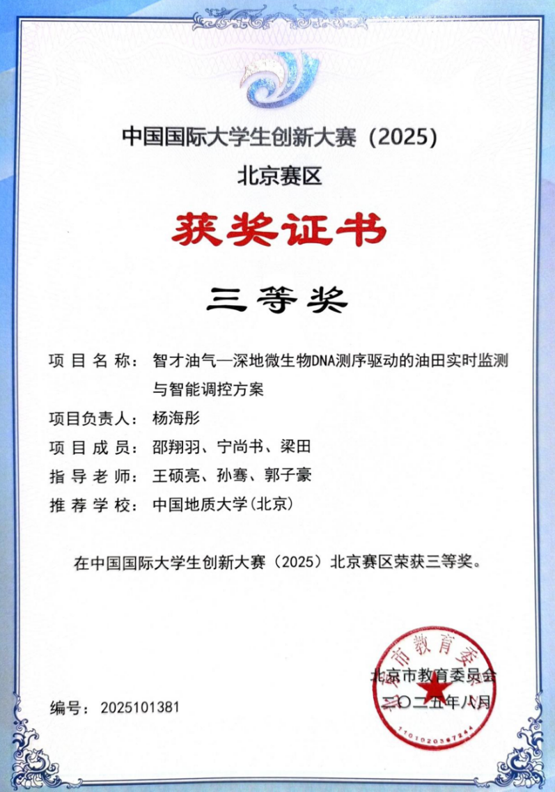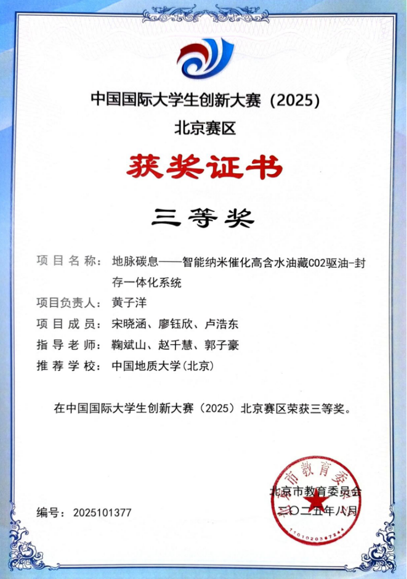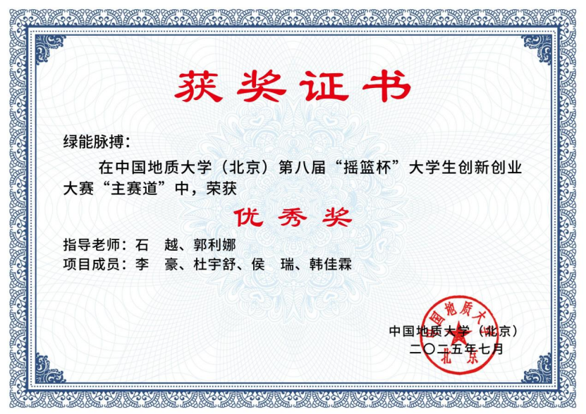能源学院在2025年创新创业赛事中斩获佳绩。在中国地质大学(北京)第八届“摇篮杯”大学生创新创业大赛中,能源学院荣获金奖1项、铜奖1项、优秀奖5项及成功参赛奖1项。在中国国际大学生创新大赛(2025)北京赛区比赛中,能源学院再获两项三等奖。